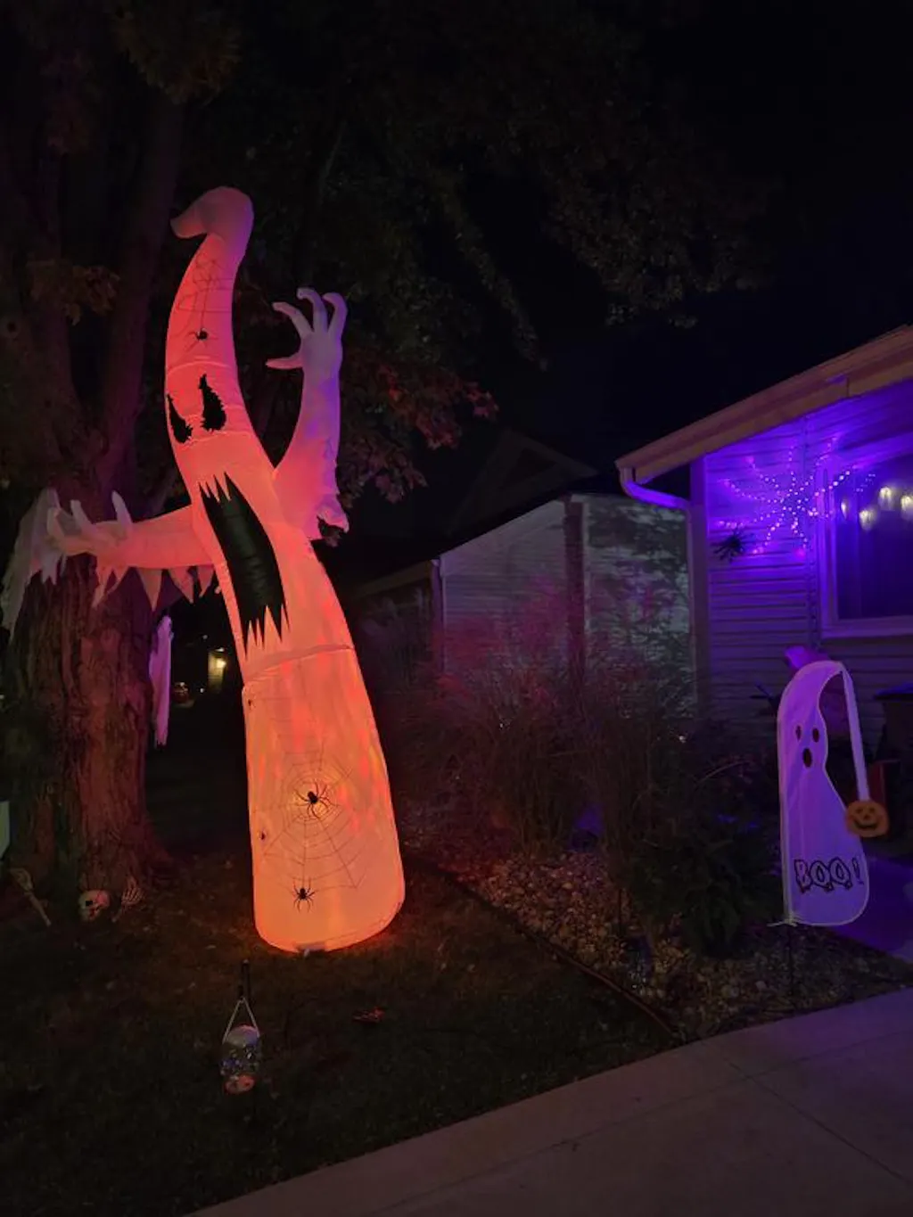 - 【Giant Scary Ghost Halloween Decoration】 - 12 ft towering halloween ghost Inflatable with spiders and webs all over its body is chilling. Built-in bright LED flame lights in the huge body, realistic look will be loved by children! Create a spooky halloween atmosphere that make your home stand out on Halloween.