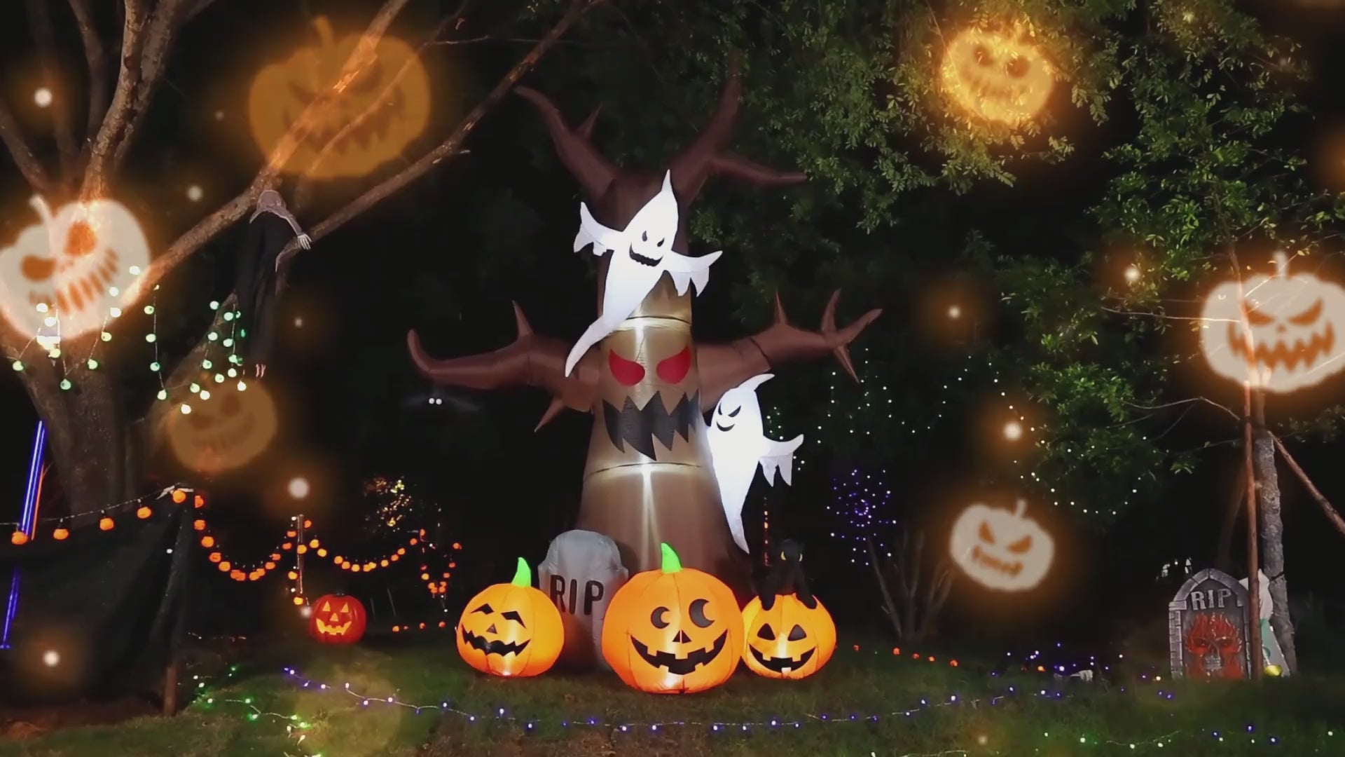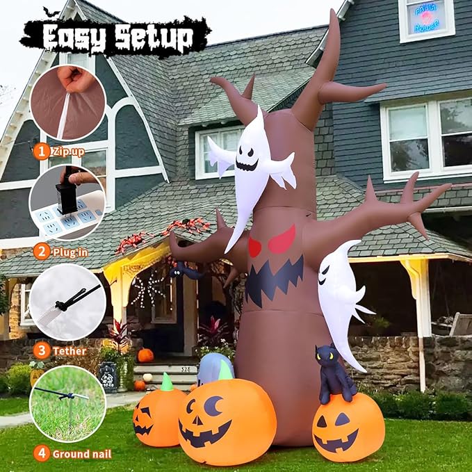 - Giant Halloween Inflatables Tree: The 12 ft Halloween Inflatable tree decorated with tombstones and pumpkins; Tree surrounded by ghosts, the spooky atmosphere is chilling; The realistic look surprises every trick-or-treater and is sure to be a hit with kids, Built-in bright LED lights in the body; Create a spooky halloween atmosphere that make your home stand out on Halloween