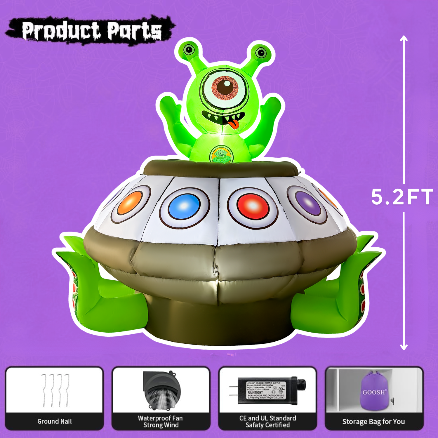 - 【Big Halloween Decoration】The GOOSH 5.2FT Outdoor Halloween Inflatable Animated Alien features a goofy one-eyed alien riding in a UFO, making a fun spooky display for your yard or party setup. The alien bobs up and down for an attention-grabbing animated effect.