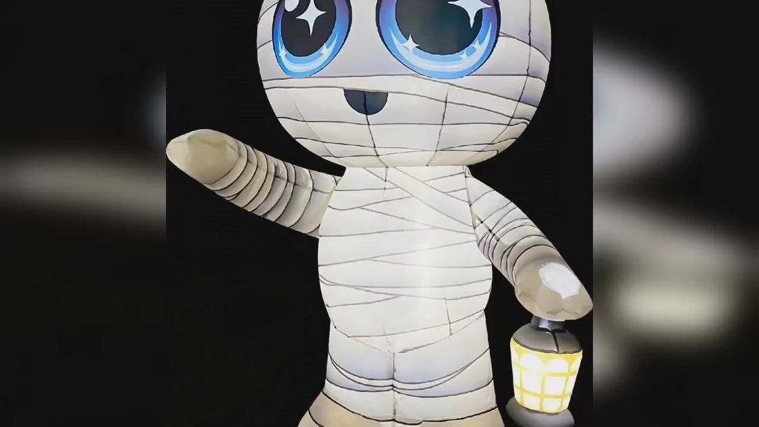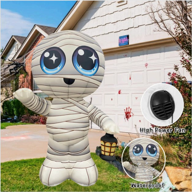 - 【Big Halloween Decoration】The GOOSH 5.2FT Outdoor Halloween Inflatable Mummy features a cute big-eyed mummy waving and holding a lantern, making a fun spooky yard display.